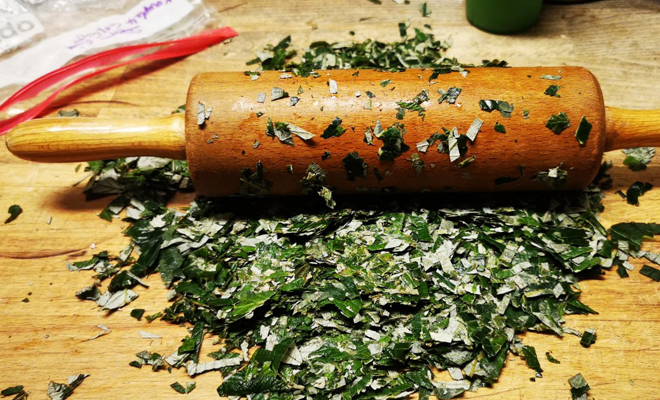 Nun nimm die Blätter wieder aus dem Kühlschrank und dem Gefrierbeutel. Man kann sich nun immer kleine Rollen aus Blätter machen, wie kleine Zigarren aus Brombeer und diese werden kann kleingeschnitten. Ich fand diese Methode zu aufwendig und hab dann die Blätter mit einem normalen Wiegemesser zerkleinert.