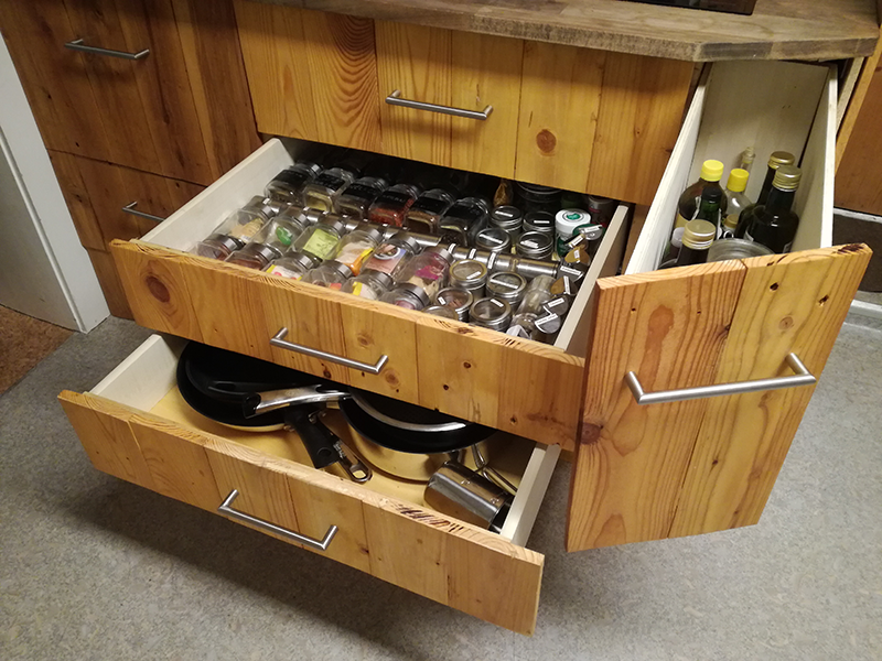 Bei konventionelle Küchen sammelt sich unter und hinter den Küchenmöbel ein Langzeitlager für Dreck und Staub. Um diese Bereiche schnell und einfach sauber zu halten, habe ich mich dazu entschieden unten Rollcontainer zu bauen. So brauche ich die Container nur rausziehen und kann dort unten schnell saugen, oder auch mal wischen. Da wir jetzt auch ländlich leben, kann ich die Mäuse da fangen, wo sie sich verstecken.