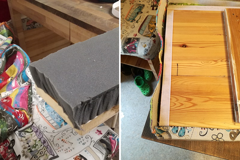 Vom Sofabau hatte ich noch Schaumstoffreste, die ich für die Sitzflächen und Lehnen zusammenstückelte und verklebte. Den Schaumstoff habe ich geschenkt bekommen. Ist eigentlich Verpackungsabfall von einem Zulieferer der Autoindustrie und wäre im Müll gelandet.