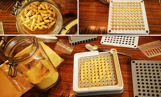 Zur Decarboxylierung reichen die Angaben im Netz von 40-60 Grad. Dieses Jahr fiel meine Ernte wesentlich geringer aus und ich wollte unbedingt mit niedriger Temperatur trocknen. Dazu habe ich mir schon im Sommer Gestelle mit Edelstahlnetz gebaut, um Kräuter und Früchte zu trocken. Die Pilze sind dieses auf diesen Gestellen getrocknet und die Temperatur war nie über 40 Grad.